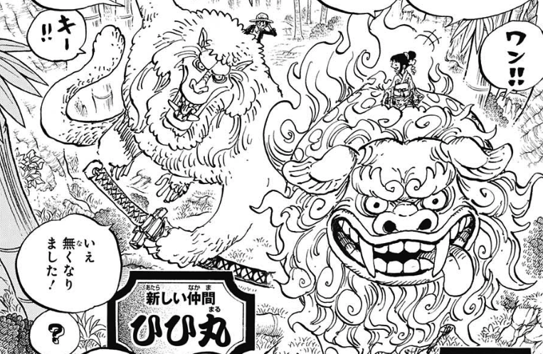 When Tama came under attack by two Beasts Pirates sentries, Komachiyo attacked their baboon guard to protect her. The two animals fought viciously, and Komachiyo was thrown into the Thousand Sunny on the beach.[1] Their fight ended when Tama managed to free herself and tame the baboon, and Komachiyo and Hihimaru took Tama and Monkey D. Luffy to see her master, Tenguyama Hitetsu.[10] Luffy and Tama later left the house, and Komachiyo offered to carry them. They came to a wasteland, and Luffy stopped Komachiyo after spotting his crewmate Roronoa Zoro.[11]