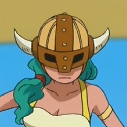 Lily is a giant with tanned skin, long green hair tied in a ponytail and blue eyes. She wears gold hoop earrings and a yellow corset, as well as a red sash wrapped around her yellow shorts. She has thigh highs and wears brown and yellow boots. When she is ready to fight, she wears a horned Viking helmet.[1]