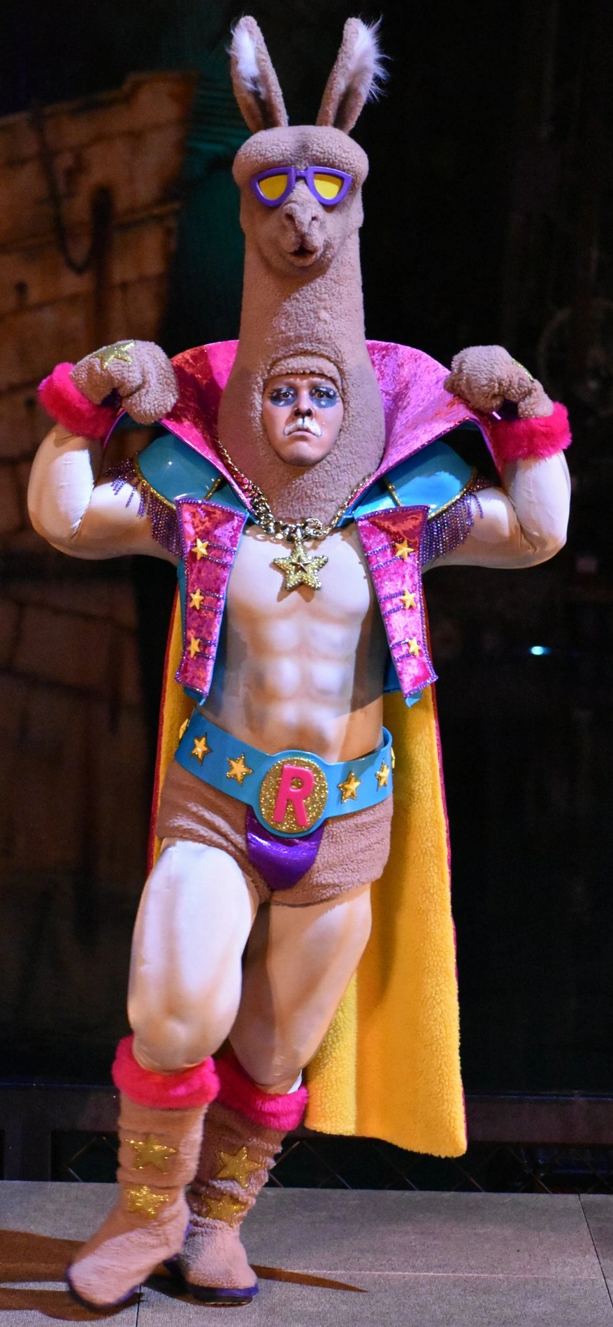 Llamaman is a muscular man wearing what appears to be mascara. Due to him eating a Llama SMILE he has the head and neck of a llama sprouting out of his scalp which is wearing purple sunglasses with yellow lenses. His outfit makes him resemble a wrestler. He wears a high-collared unbuttoned vest with star-shaped buttons, light blue shoulder pads with purple frills, a golden star on a chain connecting the collar, and a yellow cape. He wears a pair of light brown boxing gloves and a matching pair of light brown boots which have stars on them and magenta-colored rims. He also wears a pair of light brown briefs with a light blue belt with stars around it and with a pink "R" in the center.[1]