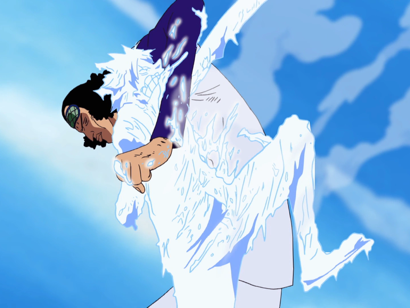 Aokiji states that he is privately on the island, does not seek a confrontation and only wanted to see where Robin ended up after leaving Arabasta. After that he helps out Tonjit to get to his tribe by freezing the path to the next island with the power of the Hie Hie no Mi. After Tonjit leaves, Aokiji confronts the crew as he sees them a threat for the world.[19] The biggest threat he sees is Robin for her ability to read the Poneglyph and tells the crew that every organization Robin belonged to does not exist anymore and she is the only survivor each time.
