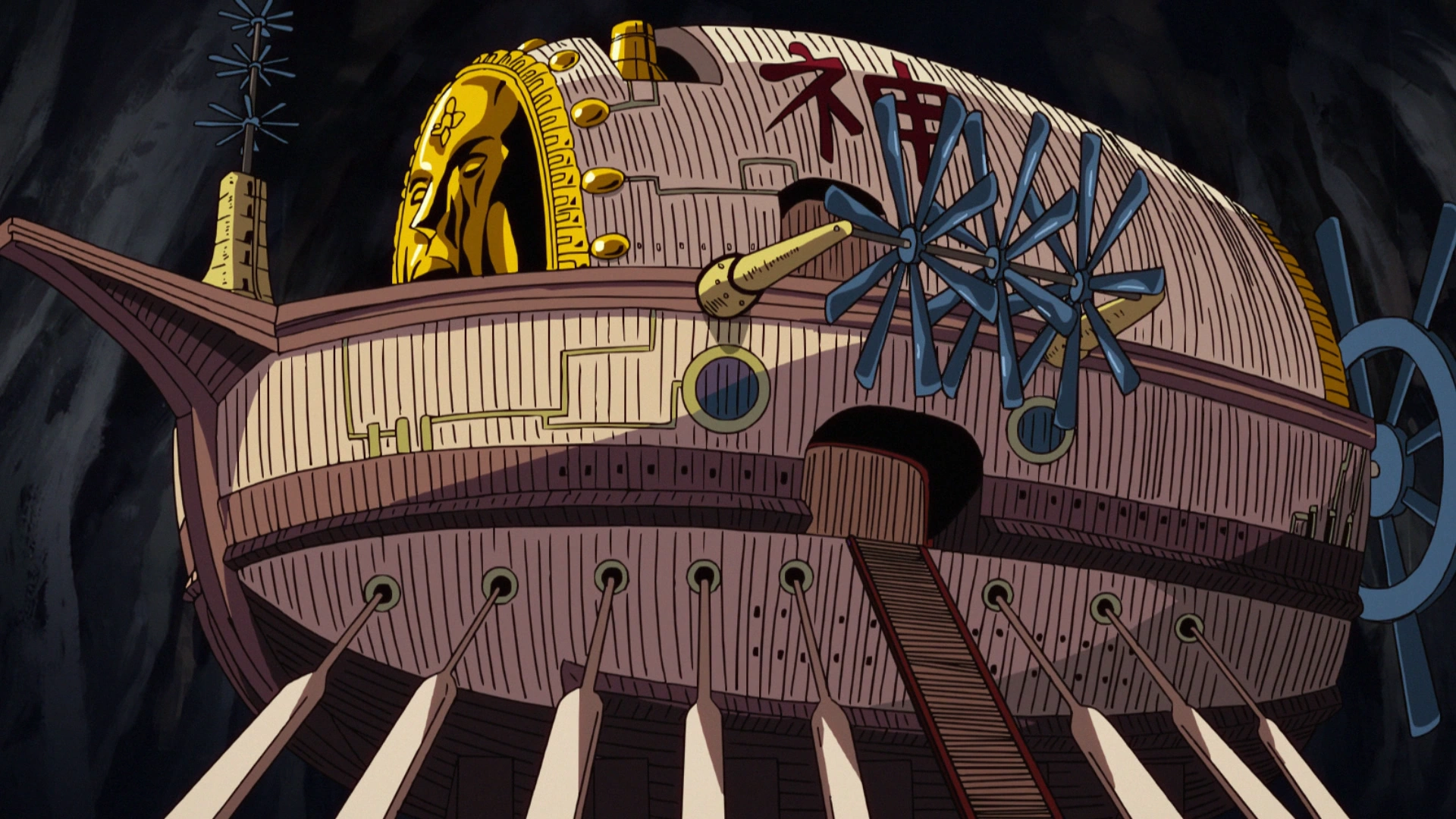 The ark contains a throne that is beneath a golden face,[2] and a large storage room.[3] The gears and generators are quite large, and it has a line of oars whose use was not shown. The ark also has multiple rotors and propellers to help it fly.[4]