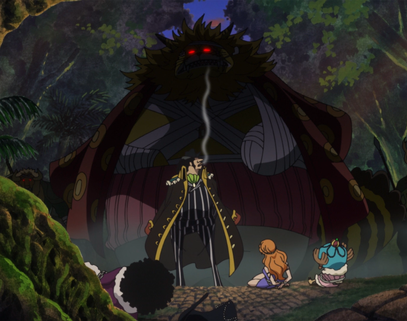 One day later, Jack left Zou when he learned of Doflamingo's defeat and capture, leaving some subordinates in the territory. Then the Straw Hat Pirates led by Sanji arrived.[79] Once they chased away the remaining pirates and neutralised Koro, the pirates tended to Nekomamushi and the wounded minks.[80]