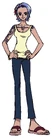 Her right arm and chest are heavily tattooed - a gesture of sympathy and condolence towards Nami, who was ashamed of her tattoo of Arlong's Jolly Roger.[7] In the manga, she also used to wear a bracelet which she gave to Nami.[8] She is usually seen wearing a beige sleeveless shirt (sometimes a green button-up shirt with yellow stripes), blue trousers and purple sandals. Furthermore, she appears to wear pink lip gloss.