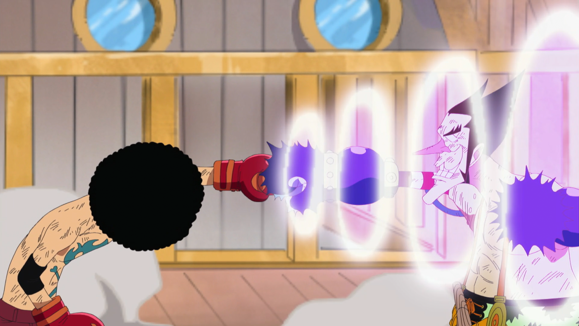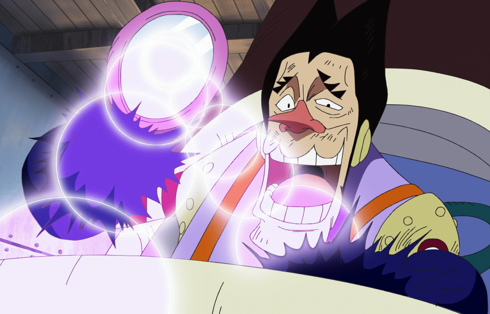 Luffy reflecting back a Noro Noro beam through a hidden mirror in his glove.
