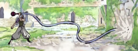 Ohm's main weapon is the Eisen Whip, a sword whose blade is Iron Cloud generated by an Eisen Dial at the hilt. In addition to taking the form of a typical sword blade, Ohm can freely manipulate the cloud's shape and increase its length and width as he pleases. This, coupled with his advanced Mantra, gives him the ability to strike opponents a great distance away from him, and since the cloud can change shape almost instantaneously and he can foresee his opponents' next moves, he can strike opponents so quickly that very few can dodge him.[9] Ohm has transformed his sword blade to resemble other weapons as it suits him, as well as into other tools like a wall. The hardness of the Iron Cloud makes the Eisen Whip extremely powerful in addition to fast and free-forming; it initially overwhelmed the tremendously strong swordsman Zoro, and when he ultimately managed to deflect it, such an action completely stunned Ohm. It also has enough cutting power to easily shatter through a thick stone wall.[12]