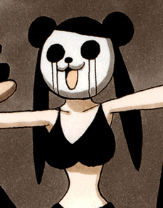 Like Pandaman, Pandawomanmi has general panda-like features, though they are often depicted vaguely to keep her appearances less obvious. She wears a black bikini style top and wears her hair in the odango bun style with pigtails, with a more human-looking body than Pandaman's, giving her the resemblance of a young woman.