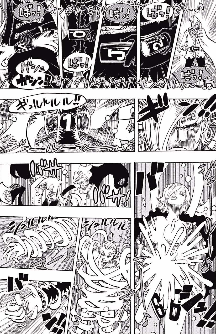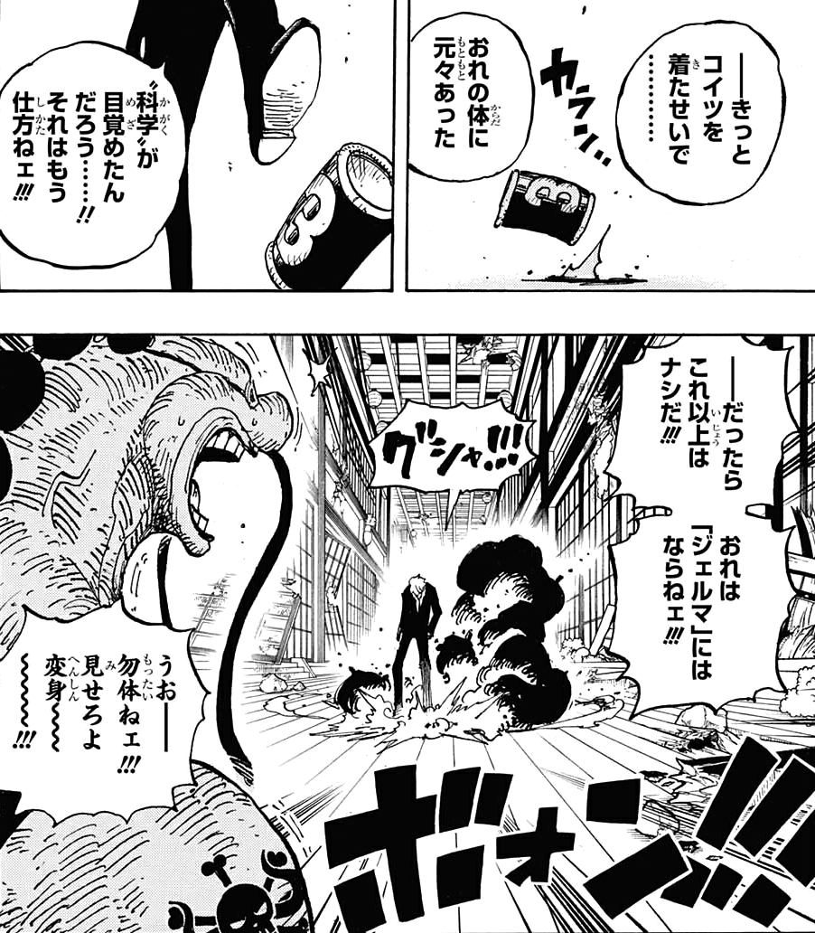 ↑One Piece Manga and Anime — Vol. 83Chapter 833 (p. 4) and Episode 793, Germa 66's soldiers are surprised about Sanji being able to fight his father without a Raid Suit.