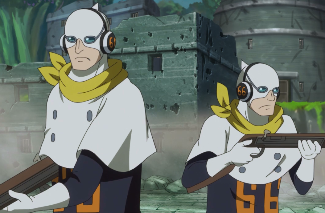 The clone soldiers of the Germa 66 wear a uniform with a slight similarity by the raid suit: It is an unicolor dark grey shirt with an orange "66" on it and pants, worn with a belt, a pair of regular grey boots and white gloves, short white cowl, a set of headphones, thin goggles, and a yellow ascot.