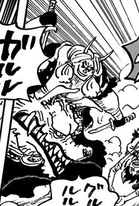 During the Raid on Onigashima, Redwolf participated in the initial rush of Gifters attacking Luffy and Zoro. He ran alongside Zoro and Luffy, and his wolf attempted to bite the two Straw Hats, though his own mouth was instead bitten shut by Luffy.[1]