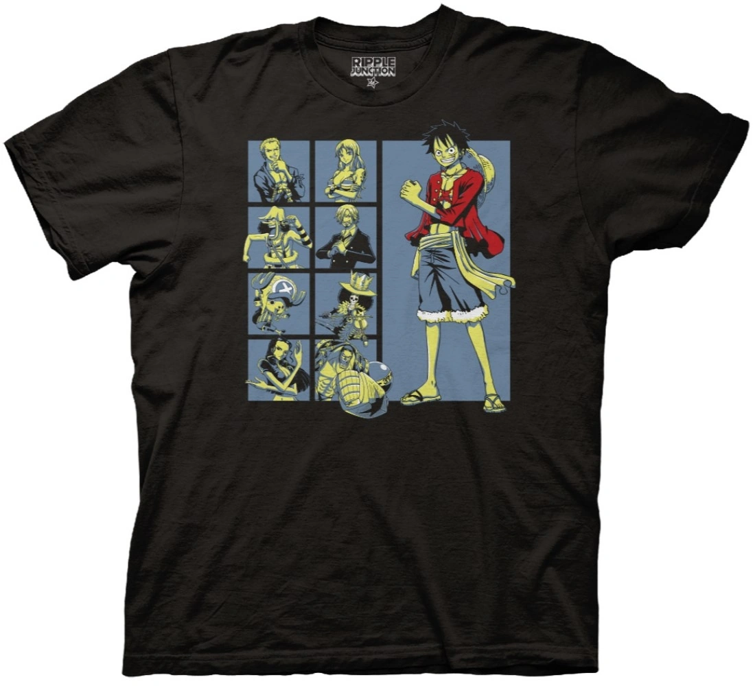 Ripple Junction is an American clothing company that has released a variety of One Piece-themed clothing items. Their products are distributed to and sold at online and physical retailers like Amazon and Walmart. Certain items are available exclusively on the Crunchyroll Store website.
