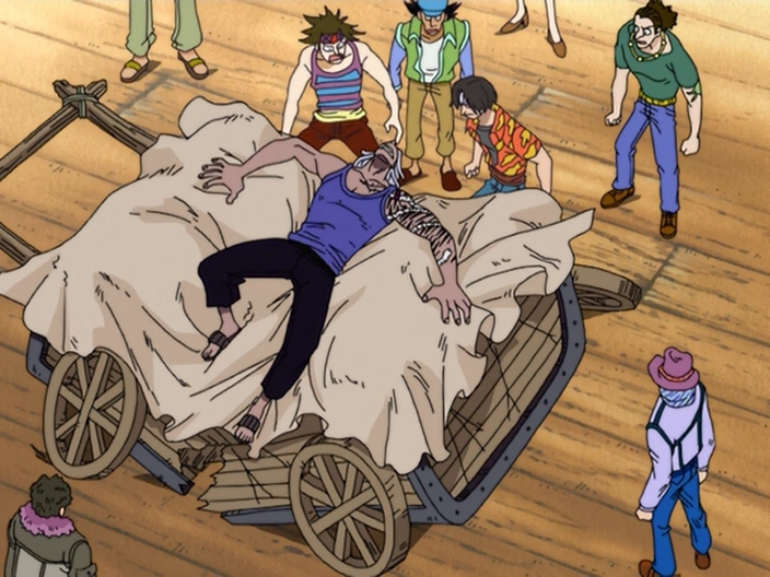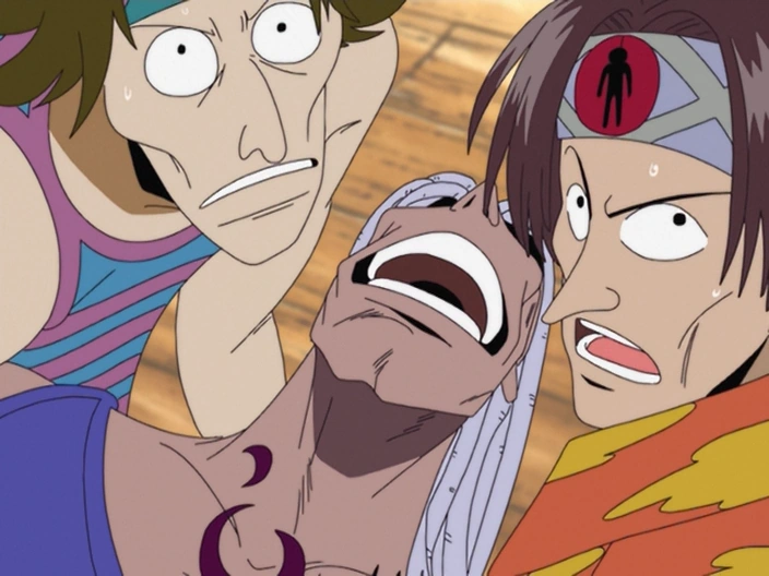 In Mock Town, Roshio won a card game against Bellamy fair and square. However, Bellamy turned around and accused Roshio of cheating. Roshio was violently beaten by Bellamy and when his crew attempted to see to his injuries, Bellamy defeated Roshio with his ultimate technique "Spring Hopper". What happened to the rest of the crew is unknown. Roughly at the same time one of the crew members also got beaten up by Jesus Burgess.[1]