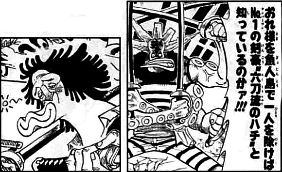 D: This is a question, but in volume 10, Hacchan names himself, "In Fish-Man Island with the exception of one person, The No. 1 swordsman 'Six Swords Style Hachi' ", so is that one exception Hyouzou? If I'm wrong, please kill me. P.N. Yuurakuron