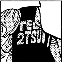 O: Yes. Well I've introduced two of these letters. Just to get things over with on the matter of the girl, I didn't go as far as thinking of a specific species for her, but I think she's probably a fishgirl based on an ancient type of fish. Because they have lots of fins, the fish from long ago. And, the clothes... are quite self explanatory. With a bit of my humor around this point of drawing the gallery of onlookers, I really got into the idea of "Situation-Explanation Shirts", so if you search, I think you'll find a variety. Even in this volume.