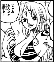 O: Ahh. That is right. The striped girl is Ishilly the ishidai, one of the island girls who was kidnapped by Caribou. Actually, all the beauties from Mermaid Cove happen to be dancers at the Mermaid Cafe. Well, seems the beauty of their dancing could very well bring an end to Sanji's life. Now then, I'll introduce the top five Mermaid Cafe Dancers.