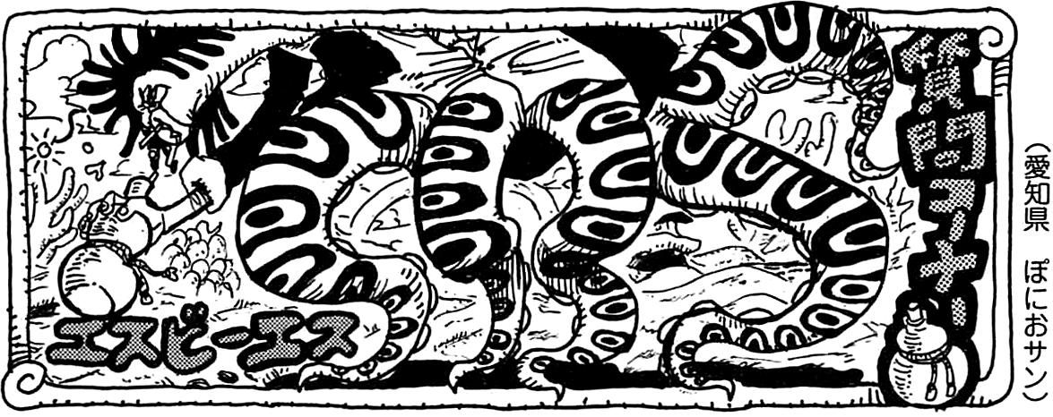 O: I see. This is pretty much subconscious on my part as well. I have been writing タイヨウ(Taiyo/sun in katakana) naturally. For example. When I'm writing childrens' conversations, AKA, stupid Luffy's conversations, I deliberately reduce the amount of kanji used in the lines and opt to write more words in hiragana. That's because I feel that writing something even the speaker himself wouldn't really understand clearly in kanji is somewhat unnatural. In the same way, for the fish-men, "The Sun" is something that they would never be able to see unless they swim 10,000 meters up to the surface. It's just not a part of their everyday lives. In short, it is something that they yearn for without really understanding. Therefore, rather than the use of kanji, the katakana version "タイヨウ" suits the word better for me in this context. "The Sun Pirates" (タイヨウの海賊団). It's the awkward naming I enjoy.