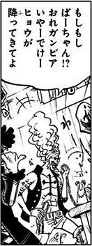 Yes, the grandma. To be honest, she isn't related by blood to anyone of the Barto Club. The Barto Club has come to be a large gang, but they originally were a group of rascals who grew up as a childhood friends in rural areas, and increased in size later on. Among them, the elite that loves the Straw Hat Pirates so much leave home and go to sea is made up of the current members. Also she is the grandma from the small-time candy store that was visited a lot by Bartolomeo and the others since they were rascals. She still is supportive of all of them. Ever since then, she helps or doesn't help out with an abundance of useful hints and infomation throughout the adventures of her boys on the sea. (Most of the time she doesn't help)