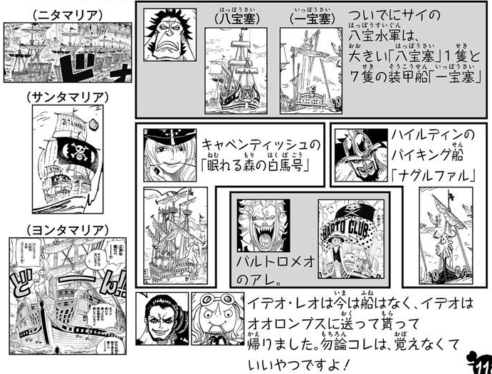 D: Oda-sensei!! Hello! In volume 80 chapter 800 you can find that "3Tamaria" and "2Tamaria" is also written on the flag of the Yonta Maria Grand Fleet. Does it display ranks? It is true that Columbus was sailing on the "3Tamaria", right? Furthermore, is the picture of the egg based on the egg of Columbus? P.N. Samurai Ryouta