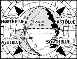 D: Hello. I don't understand the world map of the One Piece world well. "New World" or East/West/South/North Blue or Red Line, I don't know where each of them is located. Every globe-like tool is fine, so explain it comprehensibly. Please keep doing your best. P.N. Caterpillar