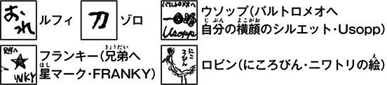 (From left to right, top to bottom. Row One: Luffy, Zoro, Usopp (To Bartolomeo, silhouette of his profile・Usopp). Row Two: Franky (to brothers star mark FRANKY), Robin (Nico Robin, chicken picture).)