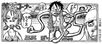 D: Hello, Oda Sensei! My birthday is October 11. There were no characters on my birthday so far, so I came up with an idea! 10/11 could be ichi (1) ban oo (0) kii wan-wan (1 1 ), meaning "the biggest doggy"! That could be the birthday for Duke Inuarashi, Ruler of Day of the Mokomo Dukedom!! P.N. Masaju