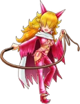 She dresses in a very skimpy red (hot pink in the anime) devil-themed outfit. Her outfit covers only the top half of her exposed breasts with fringe, which is also featured around her waist. She has long sleeves that slope into stylized rips. She has a yellow ring on the center of her stomach connecting one strap from above and two from below.[1]