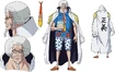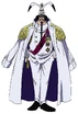 He typically wears black-rimmed glasses and a white and gold full Marine admiral uniform that is adorned with medals. The most distinctive features of this uniform are a life-size seagull on top of his cap, and his oversized Marine coat which he wears like a cape. His coat has the kanji for justice, in blue, emblazoned on the back, and has unique colored cuffs, with his being white.