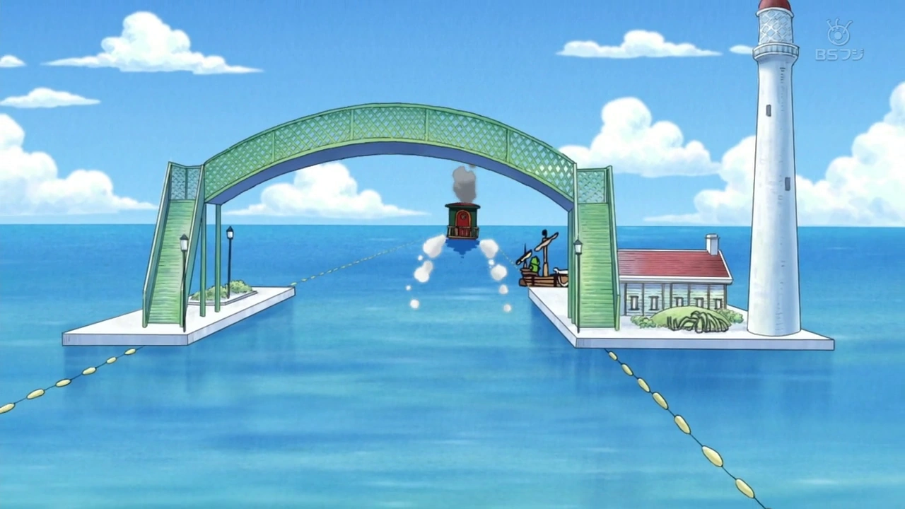 - ↑ One Piece Manga and Anime — Vol. 34 Chapter 322 and Episode 228, The Straw Hat Pirates pass by the Shift Station.