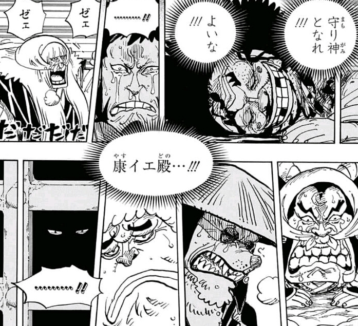 As Zoro and Sanji started a commotion by protecting Toko from Orochi,[26] Franky retrieved Yasuie's body while fighting off the shogun's forces because of Shinobu's request to not allow his body to be used on display by the enemy.[27]
