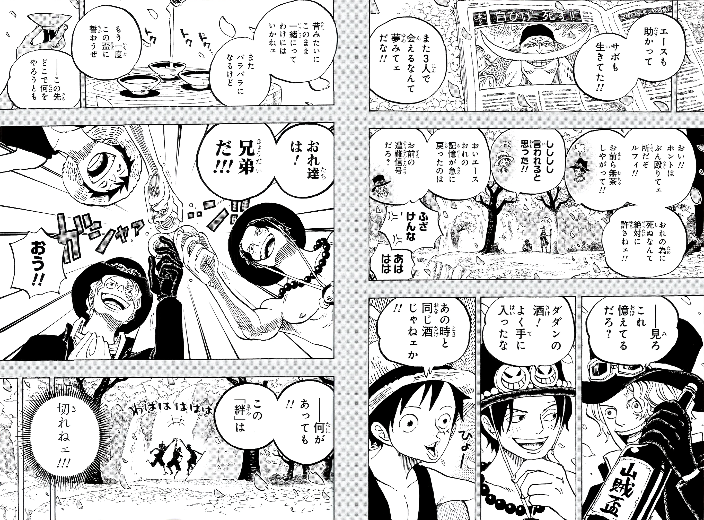 Following the war and Whitebeard's death, the brothers catch up on an unnamed island. Sabo reveals that he brought a bottle of Dadan's sake, and the three renew their brotherly vow.