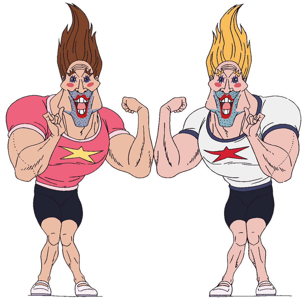 Splash and Splatter both act very effeminate and brag about their physiques by showing off their muscles. They are kind-hearted individuals as they willingly donated their blood to save a fellow human life. They end all of their sentences with the word "silly" (バカん, bakan?), followed by a heart, showing the "feminine tone" being used in speech.[1]
