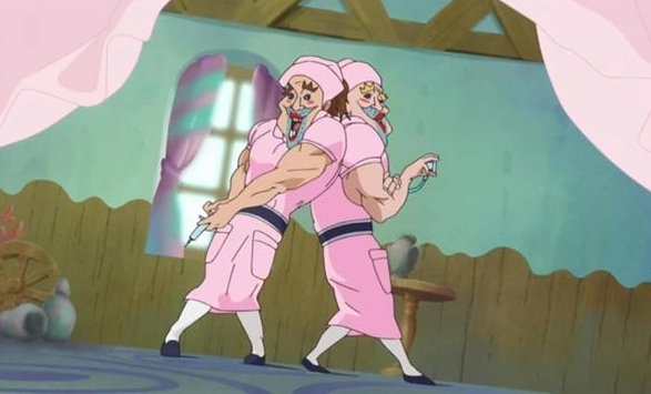In the anime, they are shown again during a scene when Sanji starts fantasizing about Nami and Robin and is about to lose more blood. Tony Tony Chopper calls Splash and Splatter who appear in pink nurse mini dresses and attempt to treat him. Sanji freaks out upon seeing them which naturally makes him snap out of his perverted dreams and prevents another nose bleed.[5]