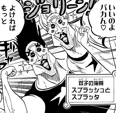 Splash and Splatter are two newkama pirate twins. They both willingly donated blood to Sanji when he was dying of severe blood loss.[1]