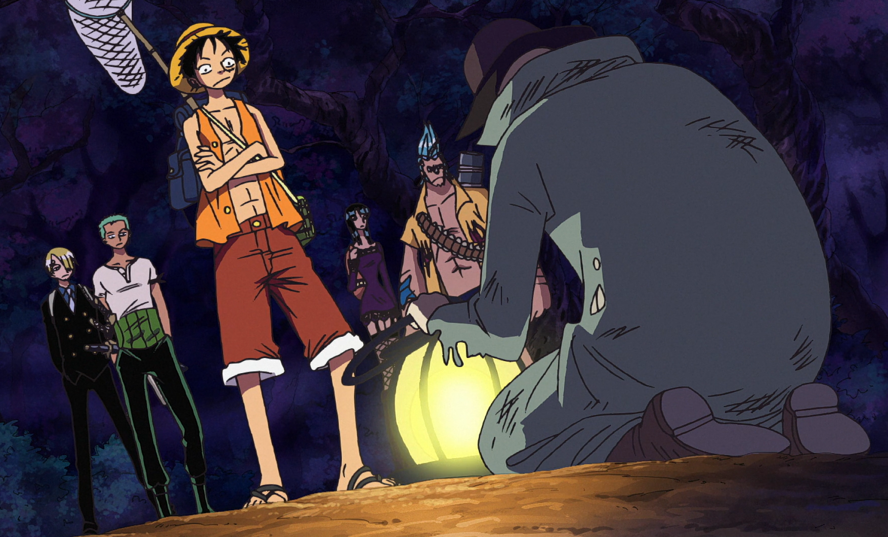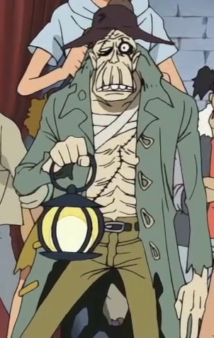 After witnessing Luffy, Zoro, Franky, Robin, and Sanji beating up the zombies at the graveyard, he begged them to defeat Gecko Moria to reclaim his shadow and the shadows of the other victims.[1] He also revealed that Thriller Bark was actually a giant ship.[4]