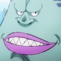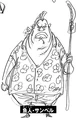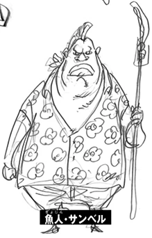 Sunbell is a tall and stout fish-man with webbed hands and a fin at the top of his head. He has large lips and tattoos on his head and arms. He wears light trousers and a Hawaiian shirt.[1]