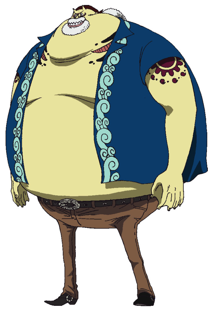 Tom was a large cowfish Fish-Man, with short horns and a yellow body. He had markings under his eyes, black spots on his neck near his gills, sharp teeth from his lower lip pointing upward, and a white beard. White, curly hair also sprouted behind his neck from under his brown bandanna, and his large chest was covered by an unbuttoned light-blue shirt with a blue pattern on it. He had a relatively small lower body in comparison to his large upper body, and he wore brown pants and simple boots. He also had a tattoo of a flowery design on both of his shoulders that is similar to the Jolly Roger of the Sun Pirates.[1]