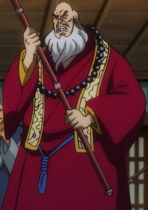Furishiro is an elderly man with a bald head, a long gray beard and a short mustache. He wears a red kimono, a golden decorated stole and beads around his neck.[1]