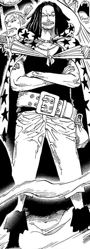 During the Marineford Arc, he attempted to fight the Blackbeard Pirates by showing his gun in a threatening manner to Van Augur.[32]