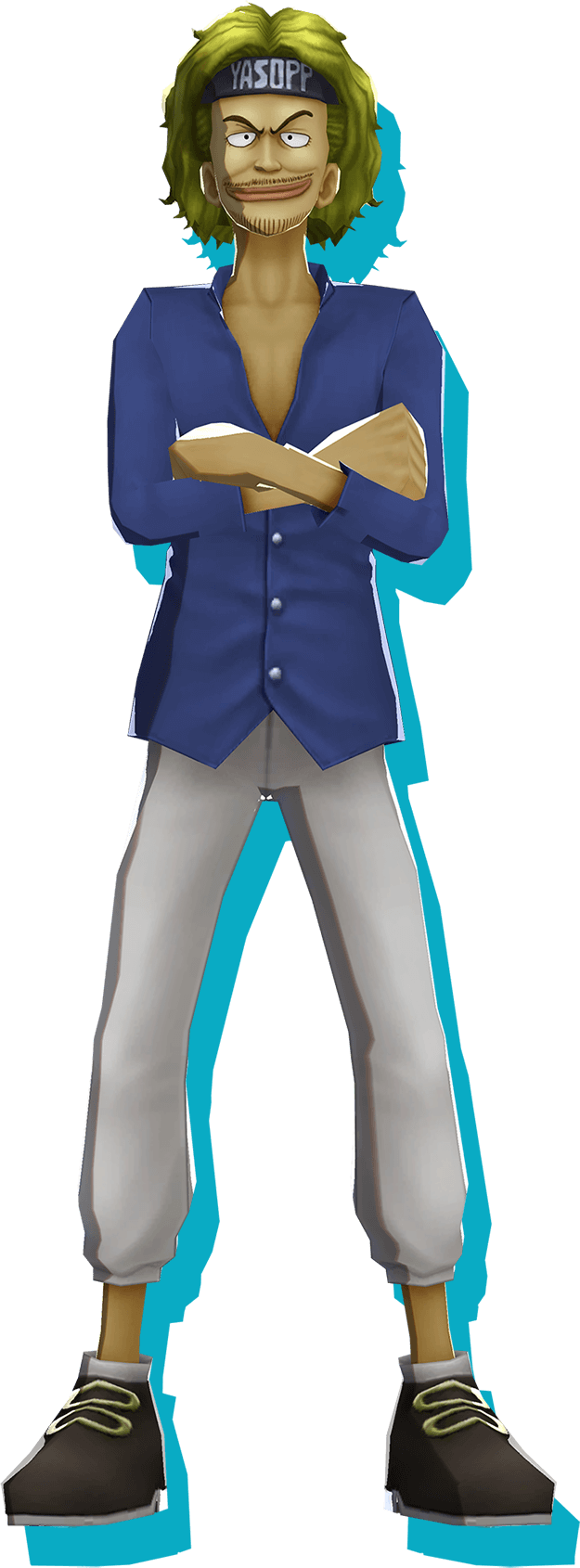 He shares many personality traits with his son, including being able to encourage the rest of his crew to join in with his fun. He is very proud of his son, Usopp, to the point where he would often talk about his son over and over again to Luffy, which led Luffy to recognize Usopp on sight from Yasopp's stories alone. During his time in Luffy's village, Yasopp felt close to Luffy because he is the same age as his son whom he left at home.[8]
