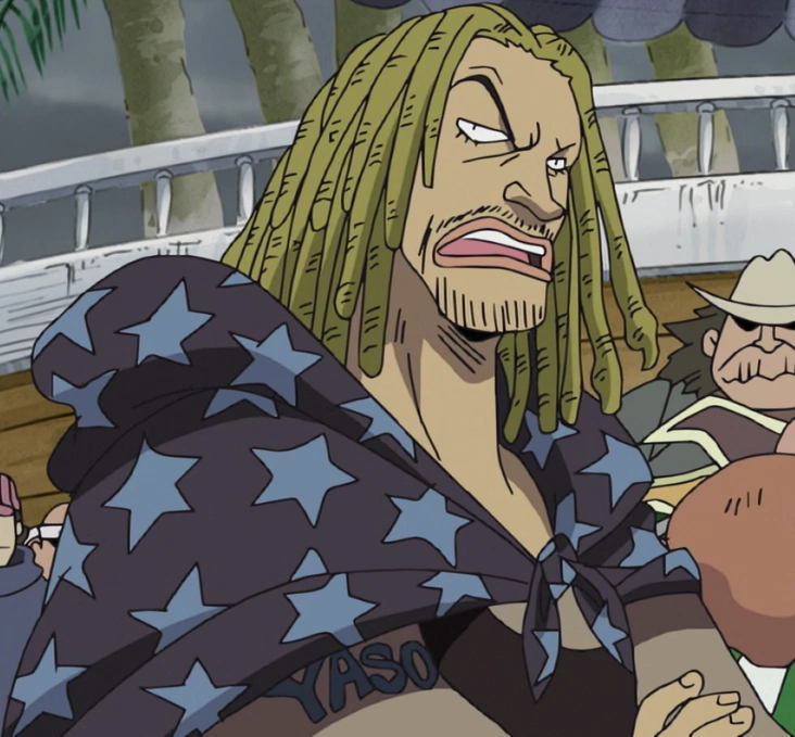 His appearance is very similar to his son, Usopp. However, he does not share the same long nose and has blond hair, the former being a hereditary trait of Usopp's mother, as well as her darker shade of hair.[8] Twenty years ago, Yasopp had the same tight curls and black hair as Usopp,[10] and in Romance Dawn, his hair was styled in loose waves,[11] but later appearances show him with it in dreadlocks. In addition to that, his body was slimmer while in his latest appearance,[2] it seems to have become more muscular.[12]