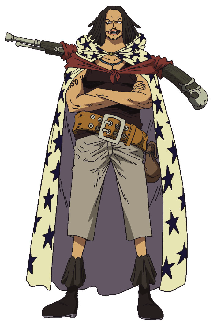 His name was written on his headband,[2] while in his latest appearance, he has no headband, and his name is written on his upper right arm.[12] During his time in Foosha Village, he wore a dark-blue shirt, dark-green pants reaching down to his calves, and blue shoes with buckles on them. He donned his headband at this time.[2] At Marineford, he sports a dark A-shirt, short pants, standard boots, and a large belt with a bag attached to it. There is also a little necklace around his neck. He retains his trademark star-patterned cape, and he has his rifle attached to his back via a band.