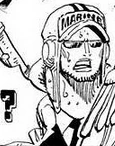 Zotto is an averaged-sized man that wears black glasses and a Marine cap with ear flaps. Under those flaps, he appears to be wearing some sort of headphones. He also wears a red tie alongside a dark green suit and a light green shirt under the standard Marine officer coat. Additionally, he also has facial hair going across the bottom of his face. He carries a rifle on his back.[1]