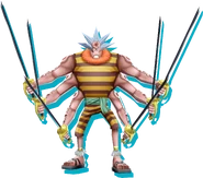 小八是原惡龍海賊團的幹部,亦是劍術實力在魚人島上僅次於藍藏的六刀流高手。擅長結合章魚的軟體和六把刀的變化型劍術。