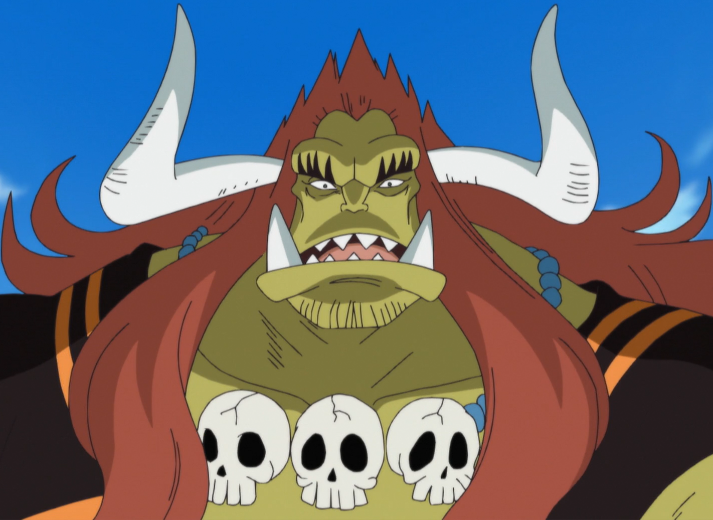 他不穿上衣,而是武士的盔甲、以及用腰帶和綠色獸皮紋的布遮住下半身。另外戴着三個骷髏頭的項鍊。