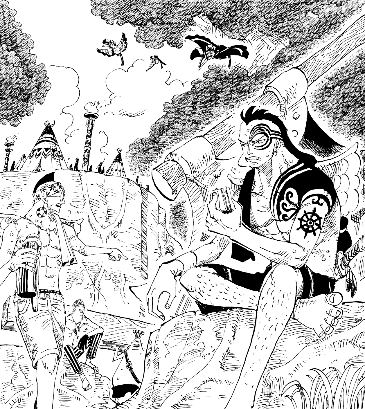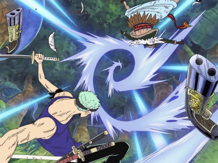 於神之島偶遇索隆並開戰,曾一度占上風。不過可惜被索隆新開發的三十六煩惱風打敗,倒地不起。[4]