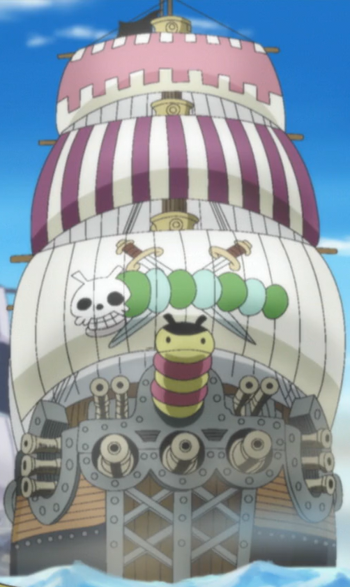 - 可以粗略地看見艾波伊達的船以及海賊旗——翠綠色的毛毛蟲長出一顆骷髏頭,背後雙劍交叉。