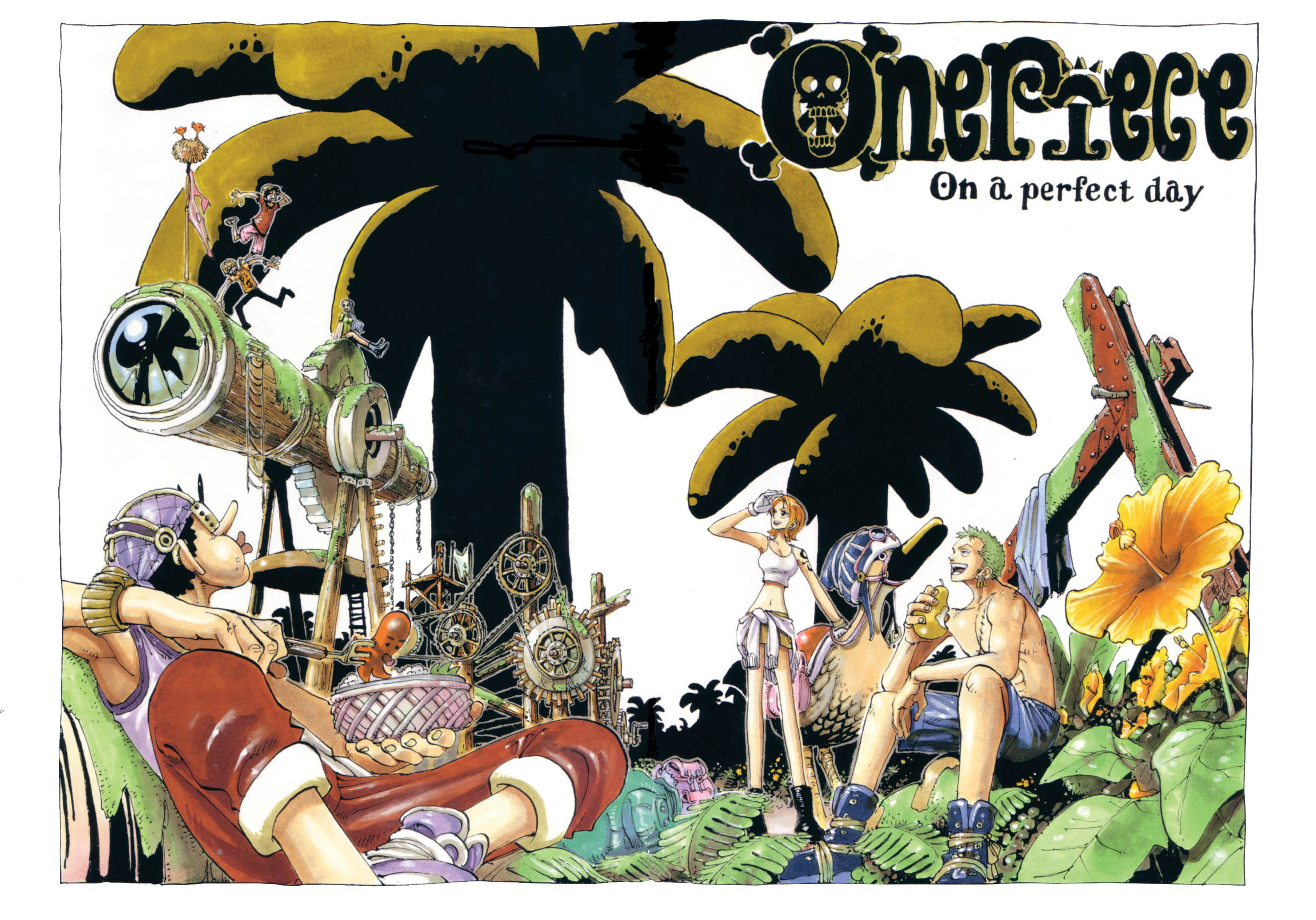 彩頁:熱帶雨林中的草帽一行人。題詞為「On a perfect day」。