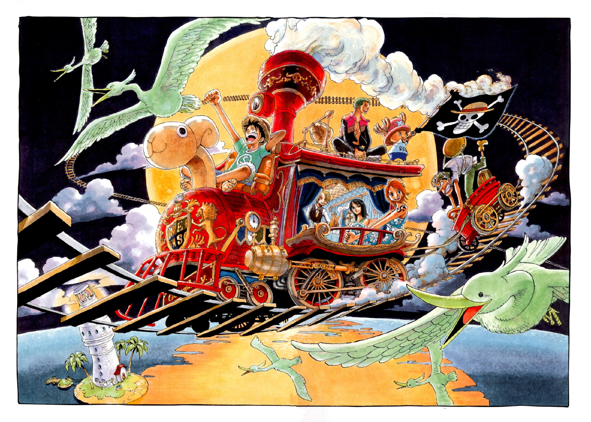 彩页:草帽一行人搭乘在空中的海上列车。列车头是前进梅利号,周围有大鸟飞翔,月亮在背景。