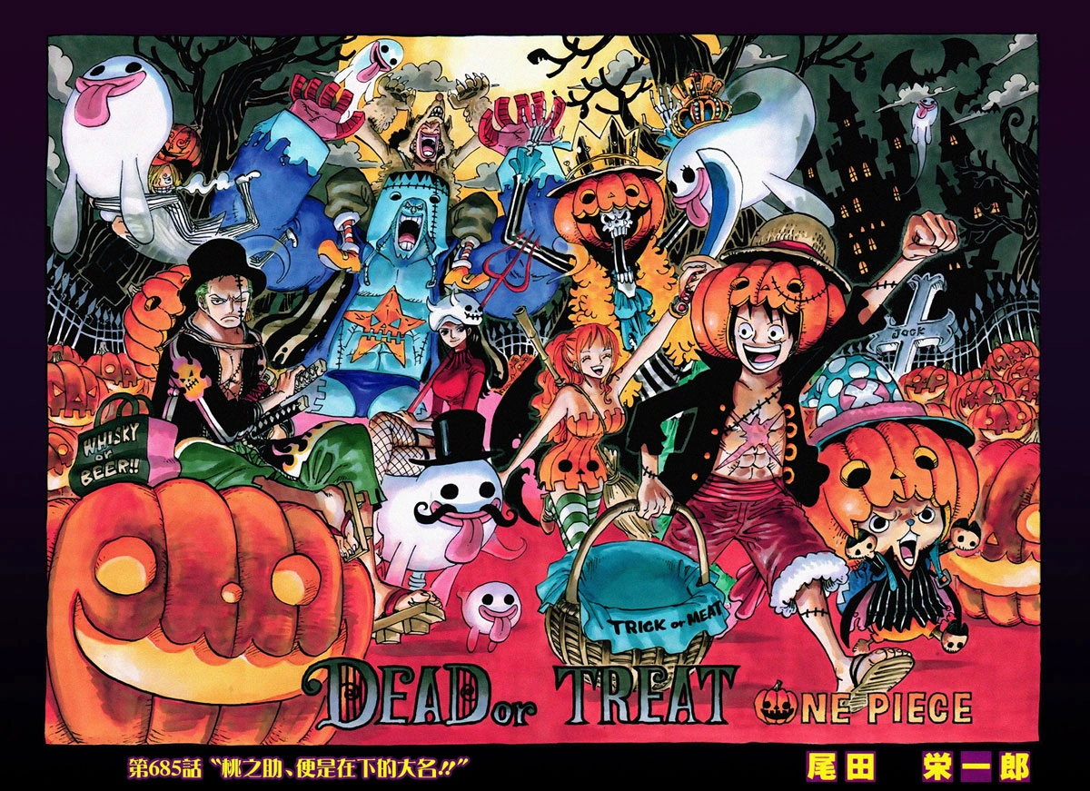 彩頁:草帽海賊團作萬聖節裝扮,穿過南瓜燈和幽靈的道路。